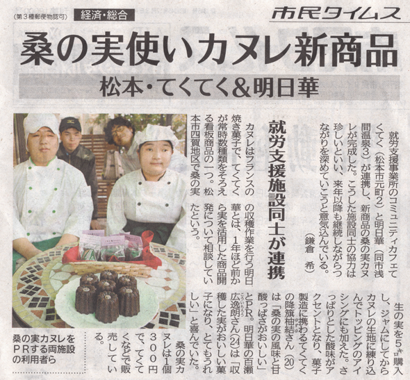 明日華と交流のある事業所「てくてく」さんに、明日華の桑の実でカヌレを開発していただきました。