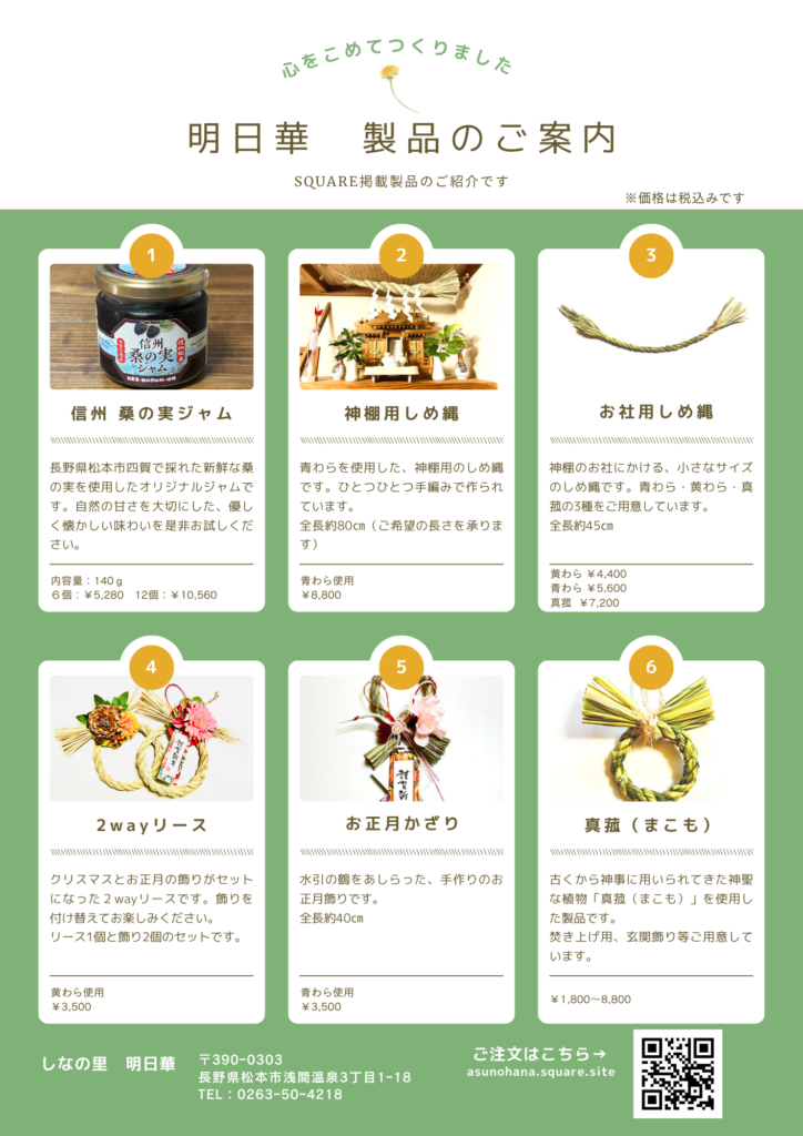明日華製品のオンライン販売☺ 2025 12/16 Uncategorized 2025年12月16日 明日華の製品をオンラインでも購入していただけるようになりました! すべての製品を「心と身体にやさしい」をコンセプトにして作っています。 ぜひご覧ください☺ しなの里明日華合同会社 Home | しなの里明日華合同会社 Uncategorized うつ病、リワーク、就労移行支援、施設外就労、復職支援、新天地、浅間温泉、発達障害、精神疾患、統合失調症、自閉症スペクトラム、 よかったらシェアしてね! URLをコピーしました! URLをコピーしました! お正月飾り 販売開始🎍 この記事を書いた人 asunohana_admin 関連記事 お正月飾り 販売開始🎍 2025年12月15日 桑の実コラボのカヌレ 2025年9月25日 「家族」の支援を考える 2025年9月5日 魚つかみ、新聞に掲載されました 2025年8月14日 イベント参加しました 2025年8月13日 四賀魚つかみ、開催しました! 2025年8月8日 8/2四賀魚つかみについて 2025年7月31日 <四賀>夏の自然体験フェス、MGプレスに掲載されました! 2025年7月29日 コメント コメントする コメントをキャンセルコメント ※ 名前 ※ メール ※ サイト 次回のコメントで使用するためブラウザーに自分の名前、メールアドレス、サイトを保存する。 上に表示された文字を入力してください。 Δ このサイトはスパムを低減するために Akismet を使っています。コメントデータの処理方法の詳細はこちらをご覧ください。